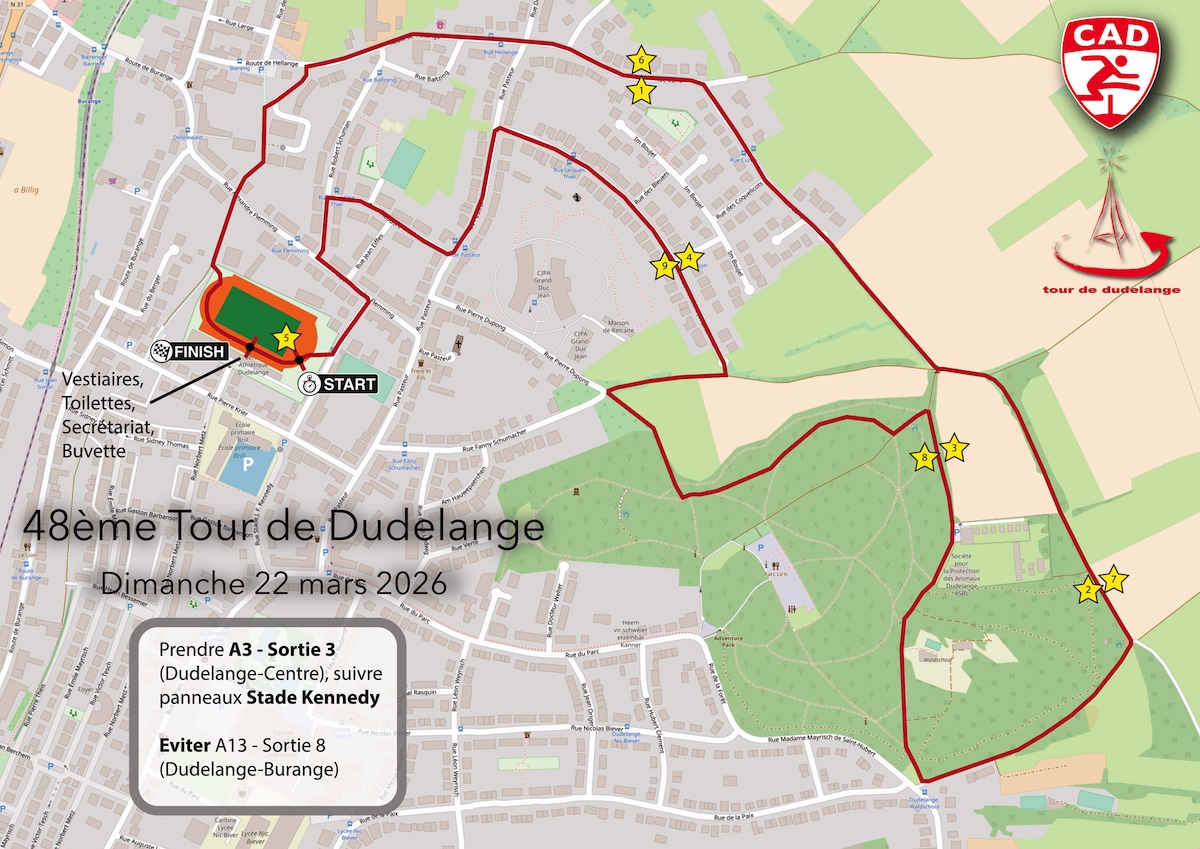 Nomeldungen op der Plaz den Dag vun der Course si méiglech ab 08:30 fir e Präis vun 15 EUR (Cash, Payconiq oder Kreditkaart).